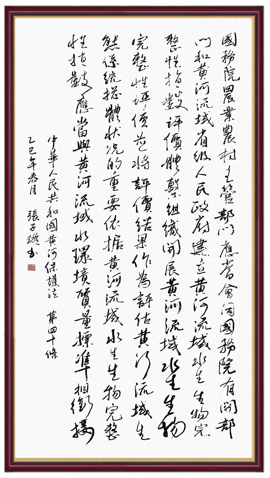 黄河宁,天下平。黄河是中华民族的发源地和摇篮,保护黄河是事关中华民族伟大复兴的千秋大计。《中华人民共和国黄河保护法》为推进水资源节约集约利用、保护传承弘扬黄河文化、推动黄河流域生态保护和高质量发展提供了有力法治保障。继书写《中华人民共和国民法典》《中华人民共和国宪法》《中华人民共和国澳门特别行政区基本法》《中华人民共和国香港特别行政区基本法》《中华人民共和国国旗法》《中华人民共和国国徽法》《中华人民共和国国歌法》《中华人民共和国法官法》等法律法规之后,法制日报社联合沿黄九省(区)司法厅、书法家协会,将笔端对准《中华人民共和国黄河保护法》。
