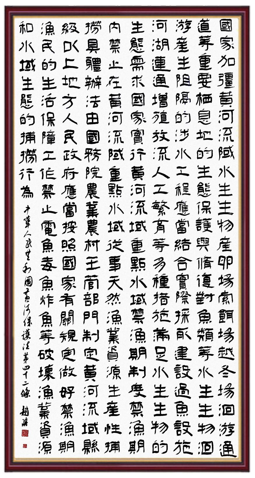 黄河宁,天下平。黄河是中华民族的发源地和摇篮,保护黄河是事关中华民族伟大复兴的千秋大计。《中华人民共和国黄河保护法》为推进水资源节约集约利用、保护传承弘扬黄河文化、推动黄河流域生态保护和高质量发展提供了有力法治保障。继书写《中华人民共和国民法典》《中华人民共和国宪法》《中华人民共和国澳门特别行政区基本法》《中华人民共和国香港特别行政区基本法》《中华人民共和国国旗法》《中华人民共和国国徽法》《中华人民共和国国歌法》《中华人民共和国法官法》等法律法规之后,法制日报社联合沿黄九省(区)司法厅、书法家协会,将笔端对准《中华人民共和国黄河保护法》。