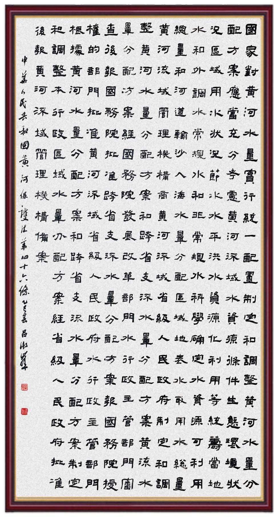 黄河宁,天下平。黄河是中华民族的发源地和摇篮,保护黄河是事关中华民族伟大复兴的千秋大计。《中华人民共和国黄河保护法》为推进水资源节约集约利用、保护传承弘扬黄河文化、推动黄河流域生态保护和高质量发展提供了有力法治保障。继书写《中华人民共和国民法典》《中华人民共和国宪法》《中华人民共和国澳门特别行政区基本法》《中华人民共和国香港特别行政区基本法》《中华人民共和国国旗法》《中华人民共和国国徽法》《中华人民共和国国歌法》《中华人民共和国法官法》等法律法规之后,法制日报社联合沿黄九省(区)司法厅、书法家协会,将笔端对准《中华人民共和国黄河保护法》。