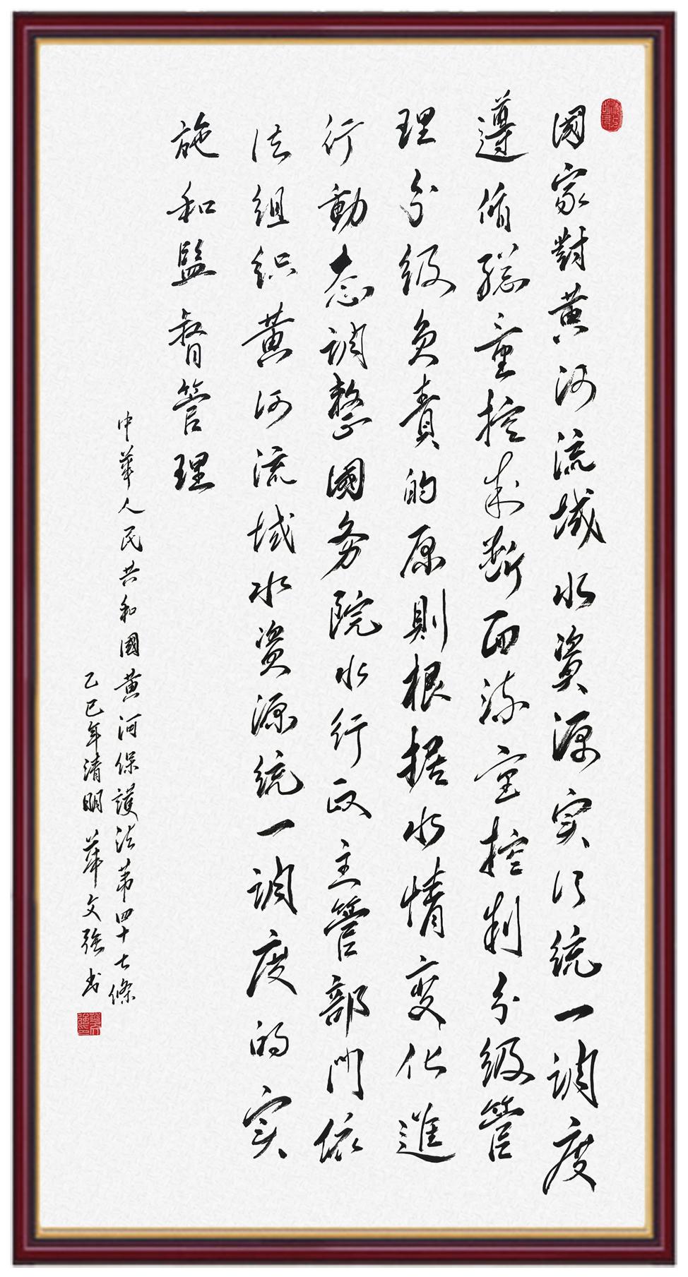 黄河宁,天下平。黄河是中华民族的发源地和摇篮,保护黄河是事关中华民族伟大复兴的千秋大计。《中华人民共和国黄河保护法》为推进水资源节约集约利用、保护传承弘扬黄河文化、推动黄河流域生态保护和高质量发展提供了有力法治保障。继书写《中华人民共和国民法典》《中华人民共和国宪法》《中华人民共和国澳门特别行政区基本法》《中华人民共和国香港特别行政区基本法》《中华人民共和国国旗法》《中华人民共和国国徽法》《中华人民共和国国歌法》《中华人民共和国法官法》等法律法规之后,法制日报社联合沿黄九省(区)司法厅、书法家协会,将笔端对准《中华人民共和国黄河保护法》。