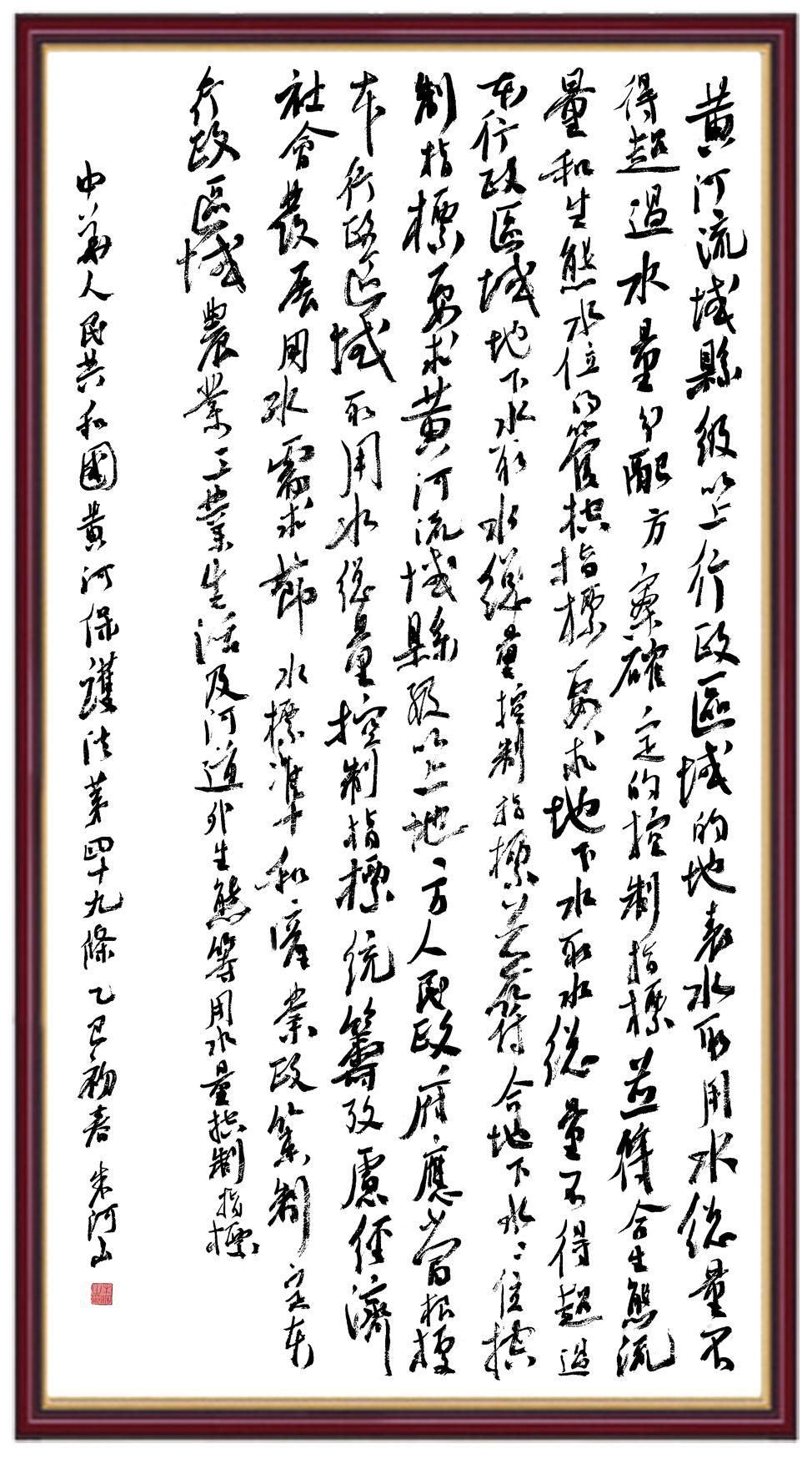 黄河宁,天下平。黄河是中华民族的发源地和摇篮,保护黄河是事关中华民族伟大复兴的千秋大计。《中华人民共和国黄河保护法》为推进水资源节约集约利用、保护传承弘扬黄河文化、推动黄河流域生态保护和高质量发展提供了有力法治保障。继书写《中华人民共和国民法典》《中华人民共和国宪法》《中华人民共和国澳门特别行政区基本法》《中华人民共和国香港特别行政区基本法》《中华人民共和国国旗法》《中华人民共和国国徽法》《中华人民共和国国歌法》《中华人民共和国法官法》等法律法规之后,法制日报社联合沿黄九省(区)司法厅、书法家协会,将笔端对准《中华人民共和国黄河保护法》。