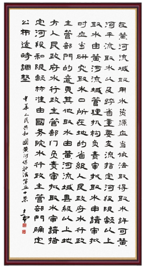 黄河宁,天下平。黄河是中华民族的发源地和摇篮,保护黄河是事关中华民族伟大复兴的千秋大计。《中华人民共和国黄河保护法》为推进水资源节约集约利用、保护传承弘扬黄河文化、推动黄河流域生态保护和高质量发展提供了有力法治保障。继书写《中华人民共和国民法典》《中华人民共和国宪法》《中华人民共和国澳门特别行政区基本法》《中华人民共和国香港特别行政区基本法》《中华人民共和国国旗法》《中华人民共和国国徽法》《中华人民共和国国歌法》《中华人民共和国法官法》等法律法规之后,法制日报社联合沿黄九省(区)司法厅、书法家协会,将笔端对准《中华人民共和国黄河保护法》。