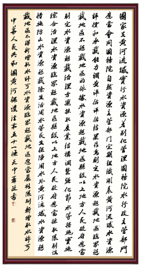 黄河宁,天下平。黄河是中华民族的发源地和摇篮,保护黄河是事关中华民族伟大复兴的千秋大计。《中华人民共和国黄河保护法》为推进水资源节约集约利用、保护传承弘扬黄河文化、推动黄河流域生态保护和高质量发展提供了有力法治保障。继书写《中华人民共和国民法典》《中华人民共和国宪法》《中华人民共和国澳门特别行政区基本法》《中华人民共和国香港特别行政区基本法》《中华人民共和国国旗法》《中华人民共和国国徽法》《中华人民共和国国歌法》《中华人民共和国法官法》等法律法规之后,法制日报社联合沿黄九省(区)司法厅、书法家协会,将笔端对准《中华人民共和国黄河保护法》。