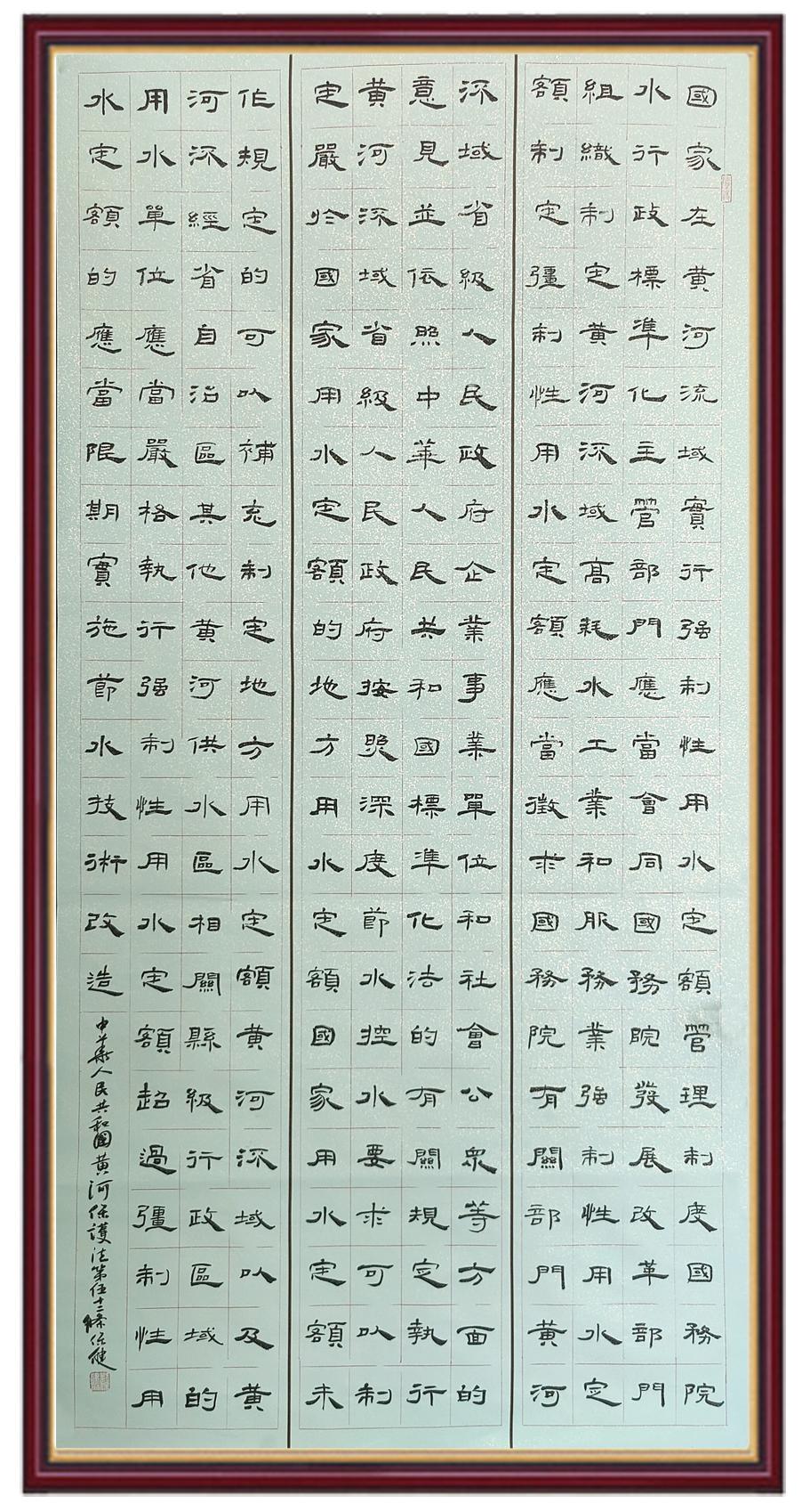 黄河宁,天下平。黄河是中华民族的发源地和摇篮,保护黄河是事关中华民族伟大复兴的千秋大计。《中华人民共和国黄河保护法》为推进水资源节约集约利用、保护传承弘扬黄河文化、推动黄河流域生态保护和高质量发展提供了有力法治保障。继书写《中华人民共和国民法典》《中华人民共和国宪法》《中华人民共和国澳门特别行政区基本法》《中华人民共和国香港特别行政区基本法》《中华人民共和国国旗法》《中华人民共和国国徽法》《中华人民共和国国歌法》《中华人民共和国法官法》等法律法规之后,法制日报社联合沿黄九省(区)司法厅、书法家协会,将笔端对准《中华人民共和国黄河保护法》。