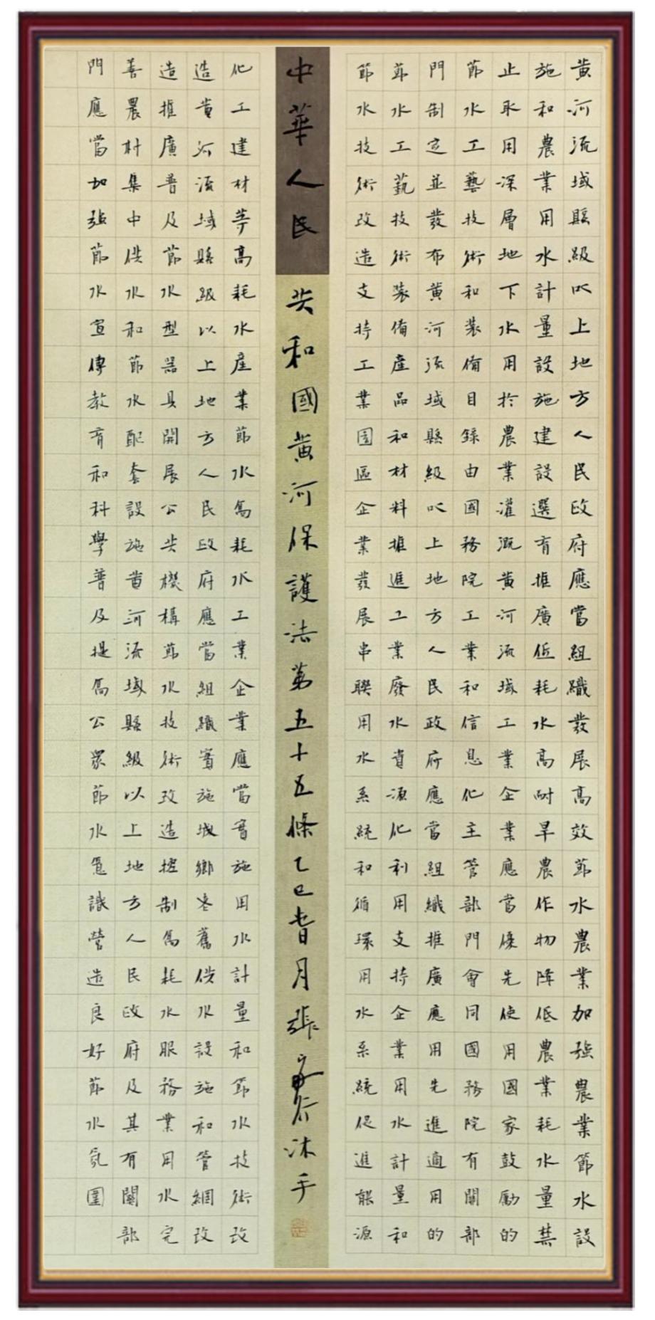 黄河宁,天下平。黄河是中华民族的发源地和摇篮,保护黄河是事关中华民族伟大复兴的千秋大计。《中华人民共和国黄河保护法》为推进水资源节约集约利用、保护传承弘扬黄河文化、推动黄河流域生态保护和高质量发展提供了有力法治保障。继书写《中华人民共和国民法典》《中华人民共和国宪法》《中华人民共和国澳门特别行政区基本法》《中华人民共和国香港特别行政区基本法》《中华人民共和国国旗法》《中华人民共和国国徽法》《中华人民共和国国歌法》《中华人民共和国法官法》等法律法规之后,法制日报社联合沿黄九省(区)司法厅、书法家协会,将笔端对准《中华人民共和国黄河保护法》。