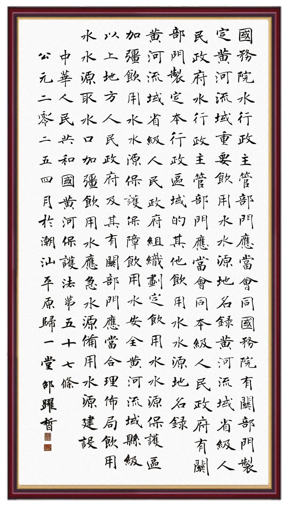 黄河宁,天下平。黄河是中华民族的发源地和摇篮,保护黄河是事关中华民族伟大复兴的千秋大计。《中华人民共和国黄河保护法》为推进水资源节约集约利用、保护传承弘扬黄河文化、推动黄河流域生态保护和高质量发展提供了有力法治保障。继书写《中华人民共和国民法典》《中华人民共和国宪法》《中华人民共和国澳门特别行政区基本法》《中华人民共和国香港特别行政区基本法》《中华人民共和国国旗法》《中华人民共和国国徽法》《中华人民共和国国歌法》《中华人民共和国法官法》等法律法规之后,法制日报社联合沿黄九省(区)司法厅、书法家协会,将笔端对准《中华人民共和国黄河保护法》。