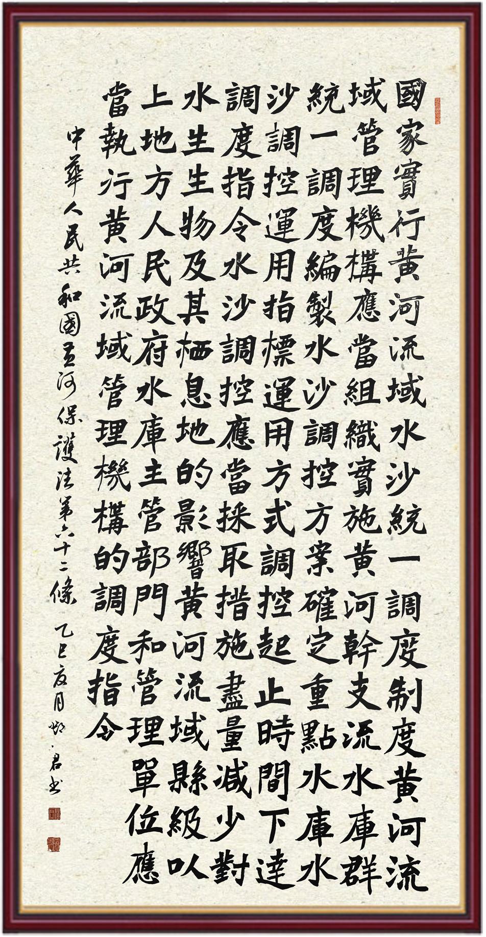 黄河宁,天下平。黄河是中华民族的发源地和摇篮,保护黄河是事关中华民族伟大复兴的千秋大计。《中华人民共和国黄河保护法》为推进水资源节约集约利用、保护传承弘扬黄河文化、推动黄河流域生态保护和高质量发展提供了有力法治保障。继书写《中华人民共和国民法典》《中华人民共和国宪法》《中华人民共和国澳门特别行政区基本法》《中华人民共和国香港特别行政区基本法》《中华人民共和国国旗法》《中华人民共和国国徽法》《中华人民共和国国歌法》《中华人民共和国法官法》等法律法规之后,法制日报社联合沿黄九省(区)司法厅、书法家协会,将笔端对准《中华人民共和国黄河保护法》。