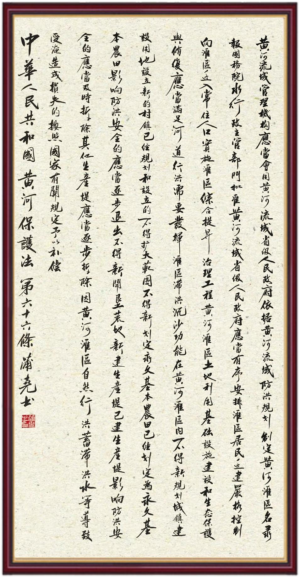 黄河宁,天下平。黄河是中华民族的发源地和摇篮,保护黄河是事关中华民族伟大复兴的千秋大计。《中华人民共和国黄河保护法》为推进水资源节约集约利用、保护传承弘扬黄河文化、推动黄河流域生态保护和高质量发展提供了有力法治保障。继书写《中华人民共和国民法典》《中华人民共和国宪法》《中华人民共和国澳门特别行政区基本法》《中华人民共和国香港特别行政区基本法》《中华人民共和国国旗法》《中华人民共和国国徽法》《中华人民共和国国歌法》《中华人民共和国法官法》等法律法规之后,法制日报社联合沿黄九省(区)司法厅、书法家协会,将笔端对准《中华人民共和国黄河保护法》。