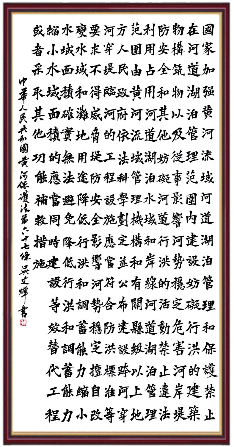 黄河宁,天下平。黄河是中华民族的发源地和摇篮,保护黄河是事关中华民族伟大复兴的千秋大计。《中华人民共和国黄河保护法》为推进水资源节约集约利用、保护传承弘扬黄河文化、推动黄河流域生态保护和高质量发展提供了有力法治保障。继书写《中华人民共和国民法典》《中华人民共和国宪法》《中华人民共和国澳门特别行政区基本法》《中华人民共和国香港特别行政区基本法》《中华人民共和国国旗法》《中华人民共和国国徽法》《中华人民共和国国歌法》《中华人民共和国法官法》等法律法规之后,法制日报社联合沿黄九省(区)司法厅、书法家协会,将笔端对准《中华人民共和国黄河保护法》。