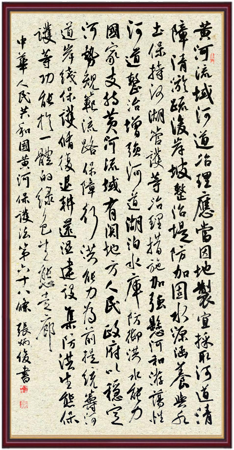 黄河宁,天下平。黄河是中华民族的发源地和摇篮,保护黄河是事关中华民族伟大复兴的千秋大计。《中华人民共和国黄河保护法》为推进水资源节约集约利用、保护传承弘扬黄河文化、推动黄河流域生态保护和高质量发展提供了有力法治保障。继书写《中华人民共和国民法典》《中华人民共和国宪法》《中华人民共和国澳门特别行政区基本法》《中华人民共和国香港特别行政区基本法》《中华人民共和国国旗法》《中华人民共和国国徽法》《中华人民共和国国歌法》《中华人民共和国法官法》等法律法规之后,法制日报社联合沿黄九省(区)司法厅、书法家协会,将笔端对准《中华人民共和国黄河保护法》。