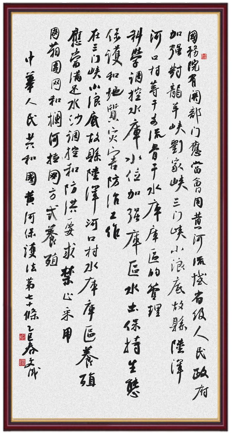 黄河宁,天下平。黄河是中华民族的发源地和摇篮,保护黄河是事关中华民族伟大复兴的千秋大计。《中华人民共和国黄河保护法》为推进水资源节约集约利用、保护传承弘扬黄河文化、推动黄河流域生态保护和高质量发展提供了有力法治保障。继书写《中华人民共和国民法典》《中华人民共和国宪法》《中华人民共和国澳门特别行政区基本法》《中华人民共和国香港特别行政区基本法》《中华人民共和国国旗法》《中华人民共和国国徽法》《中华人民共和国国歌法》《中华人民共和国法官法》等法律法规之后,法制日报社联合沿黄九省(区)司法厅、书法家协会,将笔端对准《中华人民共和国黄河保护法》。