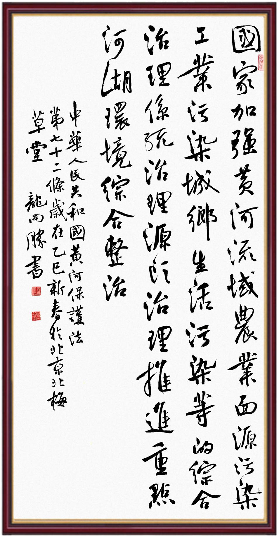 黄河宁,天下平。黄河是中华民族的发源地和摇篮,保护黄河是事关中华民族伟大复兴的千秋大计。《中华人民共和国黄河保护法》为推进水资源节约集约利用、保护传承弘扬黄河文化、推动黄河流域生态保护和高质量发展提供了有力法治保障。继书写《中华人民共和国民法典》《中华人民共和国宪法》《中华人民共和国澳门特别行政区基本法》《中华人民共和国香港特别行政区基本法》《中华人民共和国国旗法》《中华人民共和国国徽法》《中华人民共和国国歌法》《中华人民共和国法官法》等法律法规之后,法制日报社联合沿黄九省(区)司法厅、书法家协会,将笔端对准《中华人民共和国黄河保护法》。