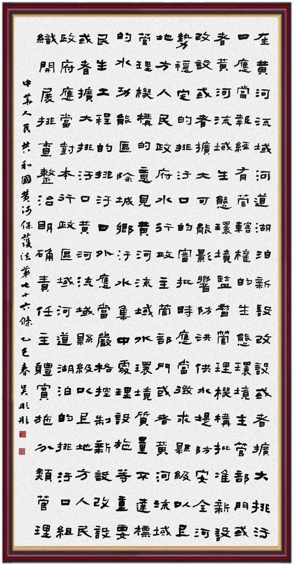 黄河宁,天下平。黄河是中华民族的发源地和摇篮,保护黄河是事关中华民族伟大复兴的千秋大计。《中华人民共和国黄河保护法》为推进水资源节约集约利用、保护传承弘扬黄河文化、推动黄河流域生态保护和高质量发展提供了有力法治保障。继书写《中华人民共和国民法典》《中华人民共和国宪法》《中华人民共和国澳门特别行政区基本法》《中华人民共和国香港特别行政区基本法》《中华人民共和国国旗法》《中华人民共和国国徽法》《中华人民共和国国歌法》《中华人民共和国法官法》等法律法规之后,法制日报社联合沿黄九省(区)司法厅、书法家协会,将笔端对准《中华人民共和国黄河保护法》。