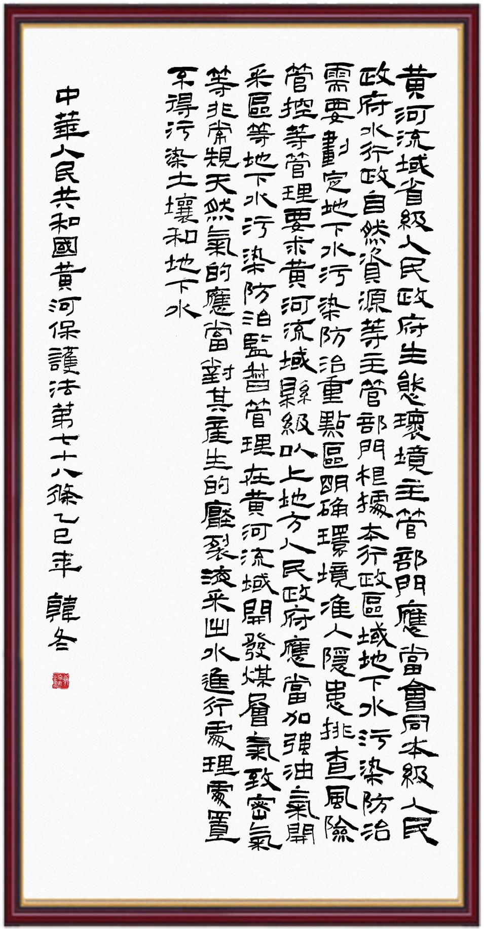 黄河宁,天下平。黄河是中华民族的发源地和摇篮,保护黄河是事关中华民族伟大复兴的千秋大计。《中华人民共和国黄河保护法》为推进水资源节约集约利用、保护传承弘扬黄河文化、推动黄河流域生态保护和高质量发展提供了有力法治保障。继书写《中华人民共和国民法典》《中华人民共和国宪法》《中华人民共和国澳门特别行政区基本法》《中华人民共和国香港特别行政区基本法》《中华人民共和国国旗法》《中华人民共和国国徽法》《中华人民共和国国歌法》《中华人民共和国法官法》等法律法规之后,法制日报社联合沿黄九省(区)司法厅、书法家协会,将笔端对准《中华人民共和国黄河保护法》。