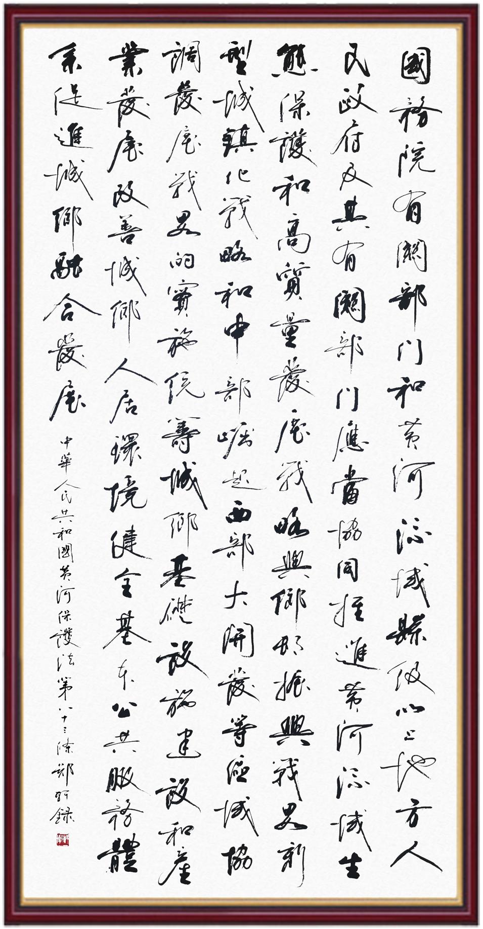 黄河宁,天下平。黄河是中华民族的发源地和摇篮,保护黄河是事关中华民族伟大复兴的千秋大计。《中华人民共和国黄河保护法》为推进水资源节约集约利用、保护传承弘扬黄河文化、推动黄河流域生态保护和高质量发展提供了有力法治保障。继书写《中华人民共和国民法典》《中华人民共和国宪法》《中华人民共和国澳门特别行政区基本法》《中华人民共和国香港特别行政区基本法》《中华人民共和国国旗法》《中华人民共和国国徽法》《中华人民共和国国歌法》《中华人民共和国法官法》等法律法规之后,法制日报社联合沿黄九省(区)司法厅、书法家协会,将笔端对准《中华人民共和国黄河保护法》。