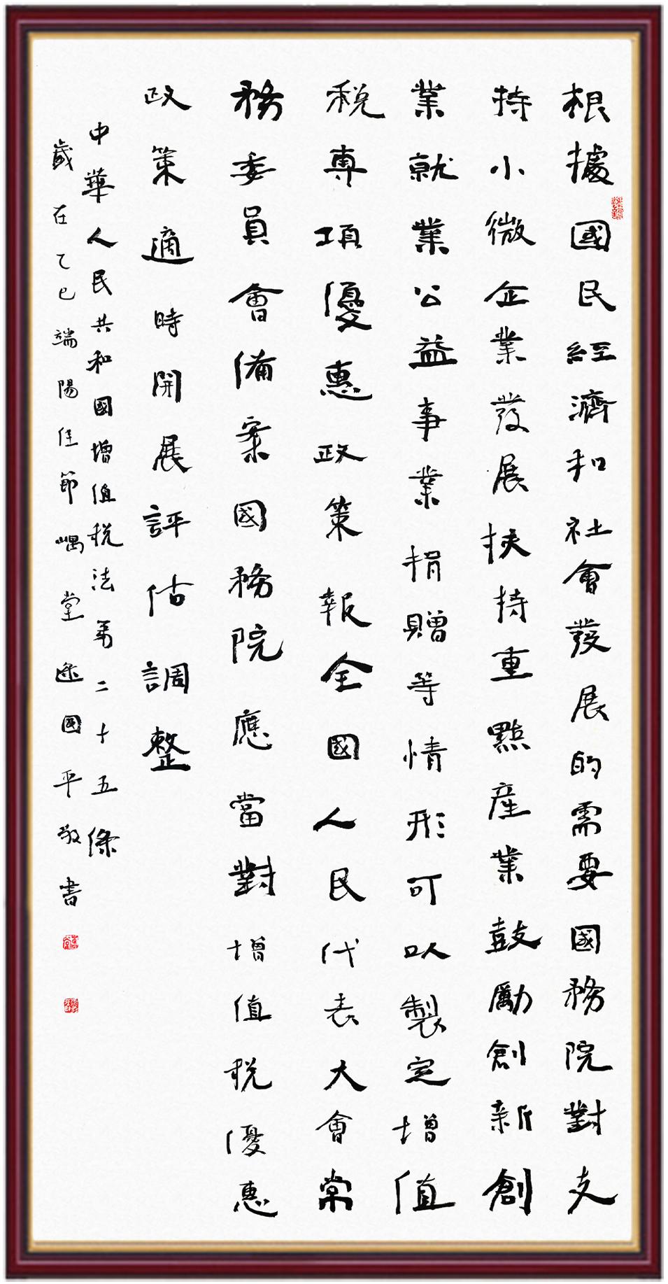 税收一头连着国计,一头连着民生。全面推进依法治税,是全面依法治国基本方略在税收领域的集中体现。《中华人民共和国增值税法》将于2026年1月1日起施行,对全面落实税收法定原则、健全有利于高质量发展的增值税制度、规范增值税的征收和缴纳、保护纳税人合法权益具有重要意义。继书写《中华人民共和国民法典》《中华人民共和国宪法》《中华人民共和国国旗法》《中华人民共和国国徽法》《中华人民共和国国歌法》《中华人民共和国法官法》《中华人民共和国黄河保护法》等法律法规之后,法制日报社将笔端对准《中华人民共和国增值税法》。