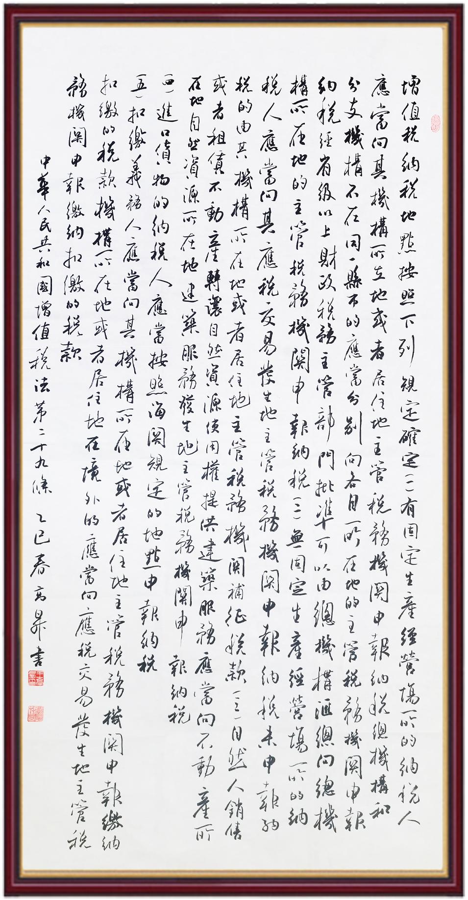 税收一头连着国计,一头连着民生。全面推进依法治税,是全面依法治国基本方略在税收领域的集中体现。《中华人民共和国增值税法》将于2026年1月1日起施行,对全面落实税收法定原则、健全有利于高质量发展的增值税制度、规范增值税的征收和缴纳、保护纳税人合法权益具有重要意义。继书写《中华人民共和国民法典》《中华人民共和国宪法》《中华人民共和国国旗法》《中华人民共和国国徽法》《中华人民共和国国歌法》《中华人民共和国法官法》《中华人民共和国黄河保护法》等法律法规之后,法制日报社将笔端对准《中华人民共和国增值税法》。