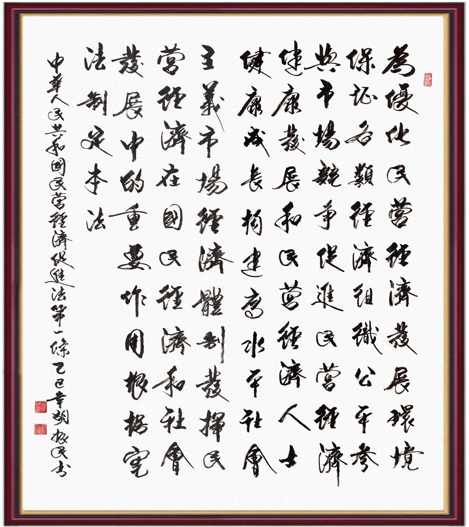 《中华人民共和国民营经济促进法》自今年5月20日起施行。作为我国首部专门关于民营经济发展的基础性法律,民营经济促进法将支持和保障民营经济发展的法律制度融入中国特色社会主义法律体系,具有重大的法治意义,为促进民营经济持续、健康、高质量发展提供了坚实的法治保障。为更好地学习、宣传、贯彻这部法律,法治日报社联合司法部普法与依法治理局,开展“‘书·法’系列活动之书写《中华人民共和国民营经济促进法》”活动。