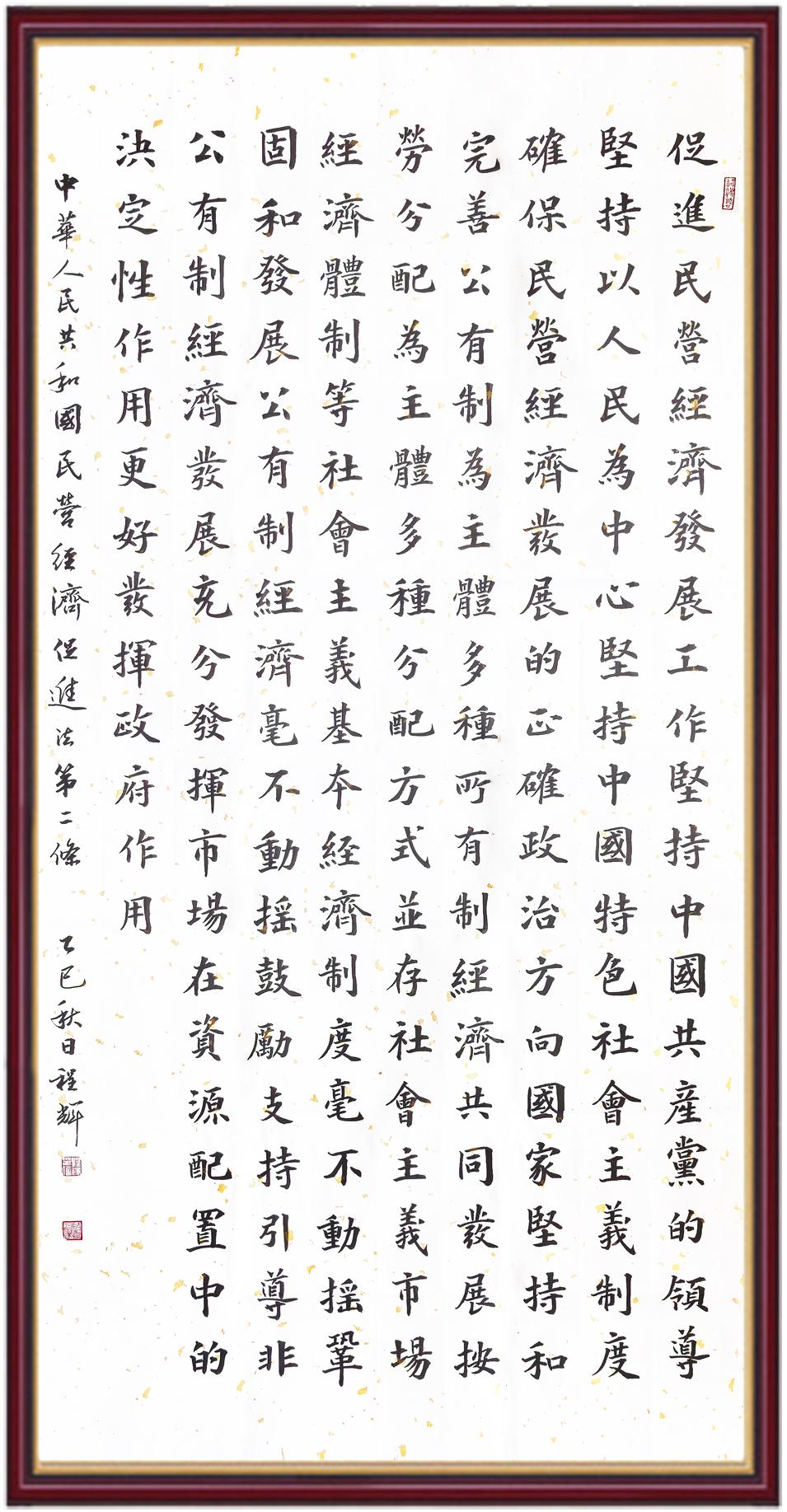 《中华人民共和国民营经济促进法》自今年5月20日起施行。作为我国首部专门关于民营经济发展的基础性法律,民营经济促进法将支持和保障民营经济发展的法律制度融入中国特色社会主义法律体系,具有重大的法治意义,为促进民营经济持续、健康、高质量发展提供了坚实的法治保障。为更好地学习、宣传、贯彻这部法律,法治日报社联合司法部普法与依法治理局,开展“‘书·法’系列活动之书写《中华人民共和国民营经济促进法》”活动。