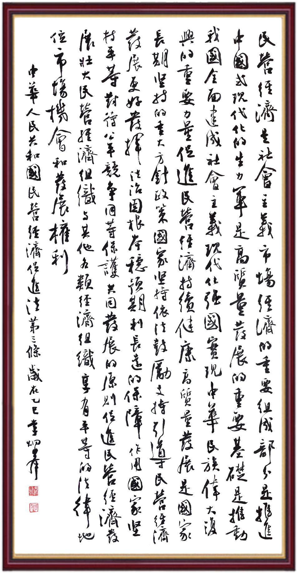 《中华人民共和国民营经济促进法》自今年5月20日起施行。作为我国首部专门关于民营经济发展的基础性法律,民营经济促进法将支持和保障民营经济发展的法律制度融入中国特色社会主义法律体系,具有重大的法治意义,为促进民营经济持续、健康、高质量发展提供了坚实的法治保障。为更好地学习、宣传、贯彻这部法律,法治日报社联合司法部普法与依法治理局,开展“‘书·法’系列活动之书写《中华人民共和国民营经济促进法》”活动。