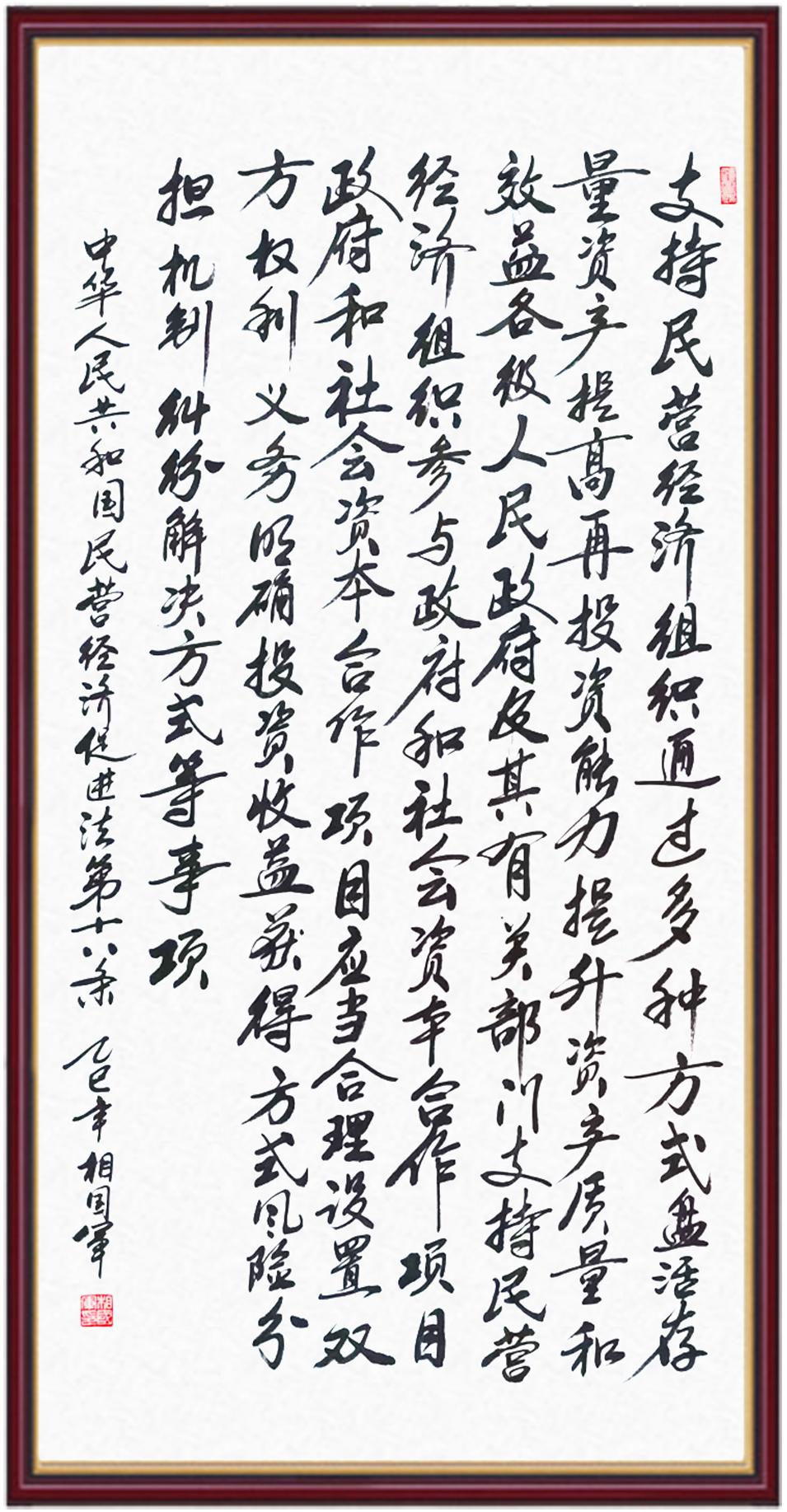 《中华人民共和国民营经济促进法》自今年5月20日起施行。作为我国首部专门关于民营经济发展的基础性法律,民营经济促进法将支持和保障民营经济发展的法律制度融入中国特色社会主义法律体系,具有重大的法治意义,为促进民营经济持续、健康、高质量发展提供了坚实的法治保障。为更好地学习、宣传、贯彻这部法律,法治日报社联合司法部普法与依法治理局,开展“‘书·法’系列活动之书写《中华人民共和国民营经济促进法》”活动。