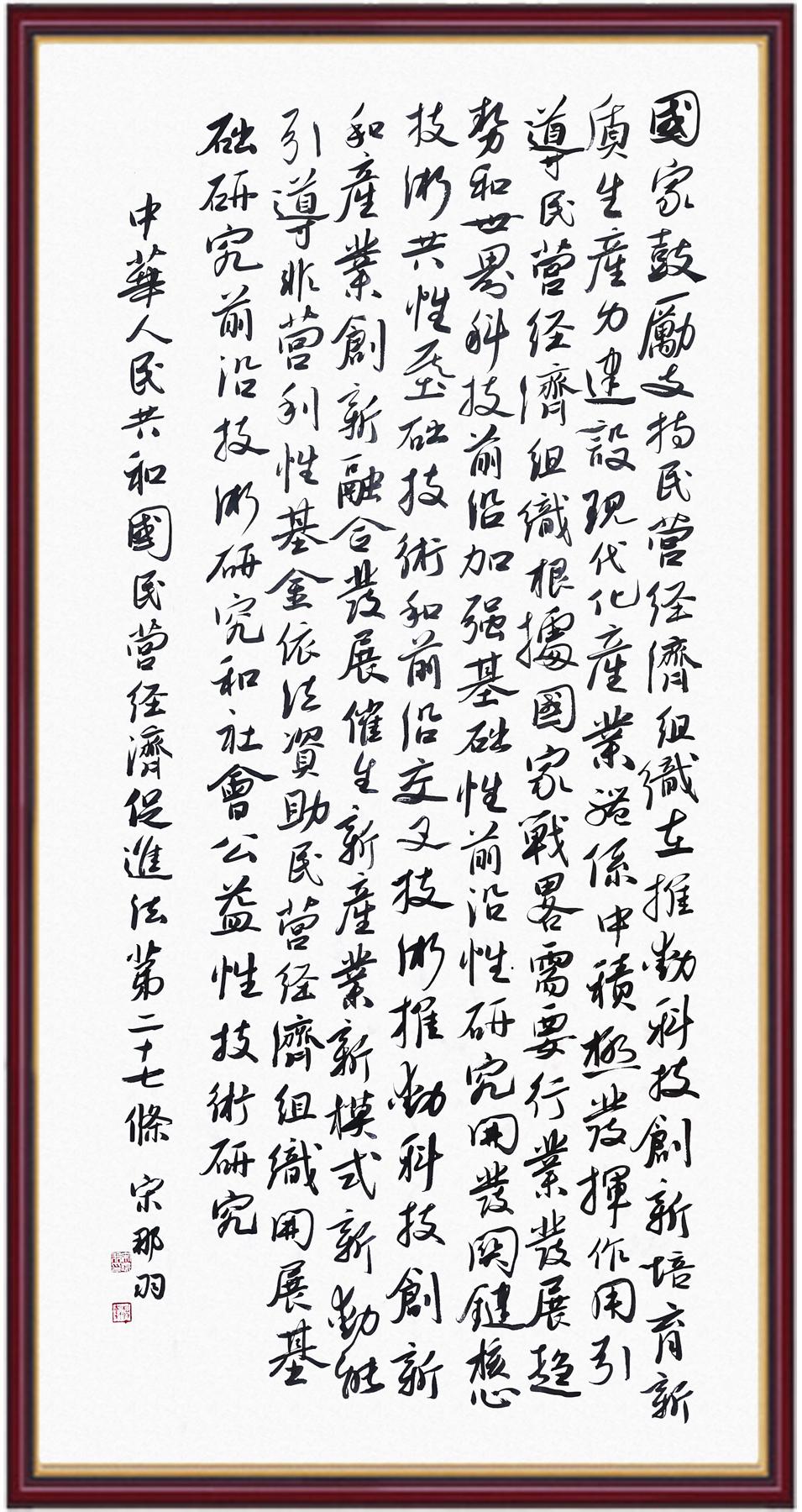 《中华人民共和国民营经济促进法》自今年5月20日起施行。作为我国首部专门关于民营经济发展的基础性法律,民营经济促进法将支持和保障民营经济发展的法律制度融入中国特色社会主义法律体系,具有重大的法治意义,为促进民营经济持续、健康、高质量发展提供了坚实的法治保障。为更好地学习、宣传、贯彻这部法律,法治日报社联合司法部普法与依法治理局,开展“‘书·法’系列活动之书写《中华人民共和国民营经济促进法》”活动。