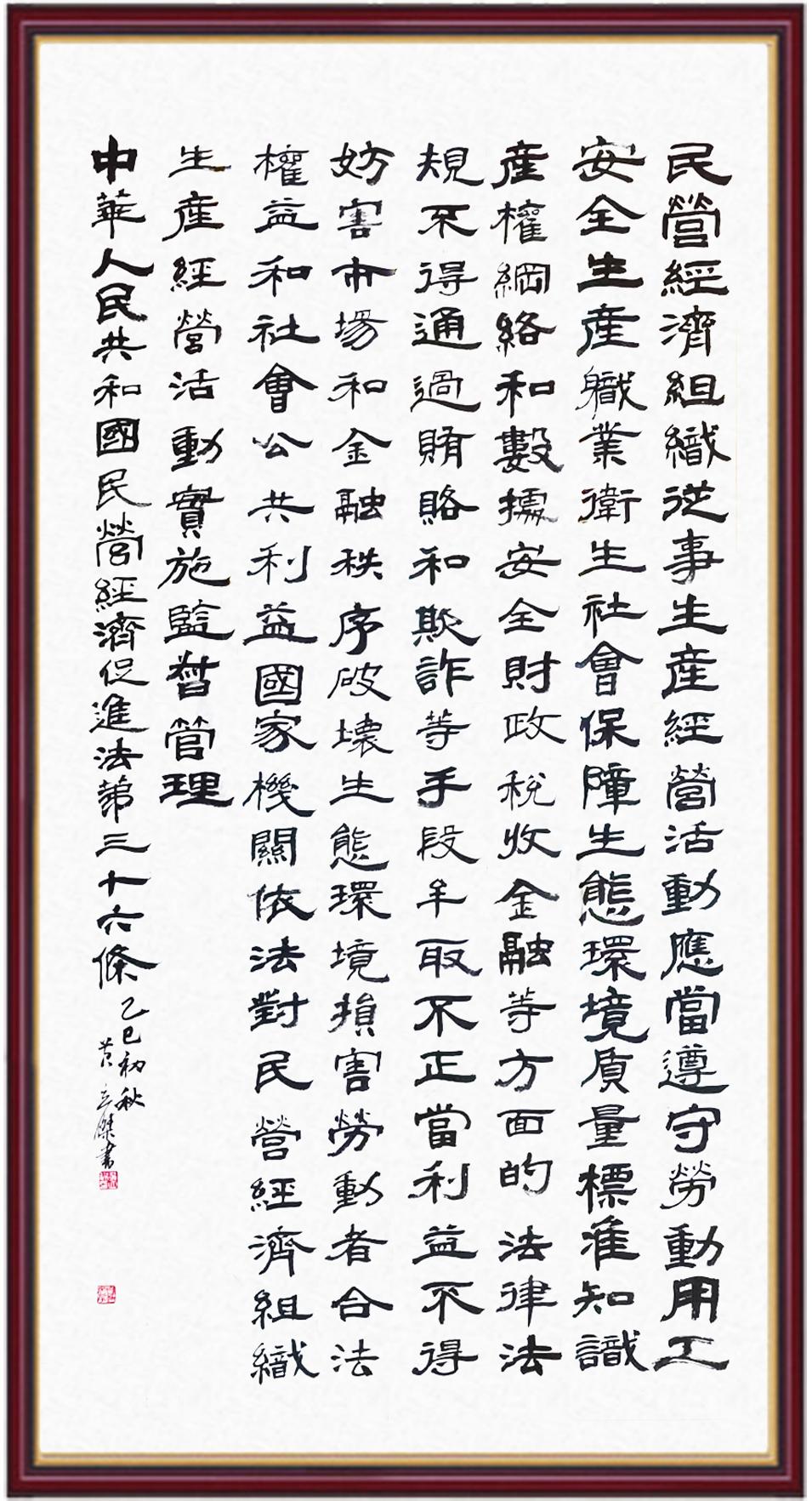 《中华人民共和国民营经济促进法》自今年5月20日起施行。作为我国首部专门关于民营经济发展的基础性法律,民营经济促进法将支持和保障民营经济发展的法律制度融入中国特色社会主义法律体系,具有重大的法治意义,为促进民营经济持续、健康、高质量发展提供了坚实的法治保障。为更好地学习、宣传、贯彻这部法律,法治日报社联合司法部普法与依法治理局,开展“‘书·法’系列活动之书写《中华人民共和国民营经济促进法》”活动。