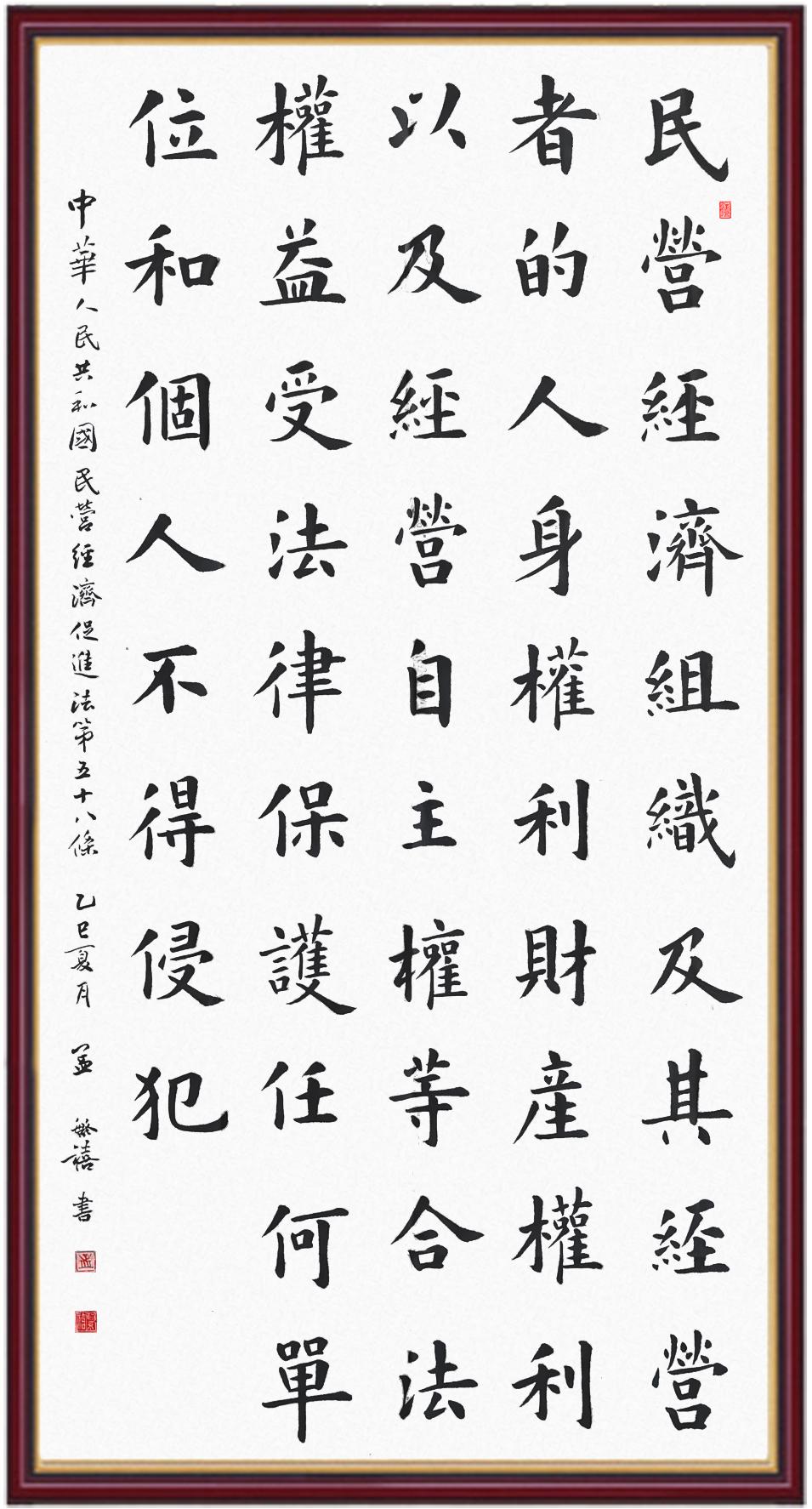 《中华人民共和国民营经济促进法》自今年5月20日起施行。作为我国首部专门关于民营经济发展的基础性法律,民营经济促进法将支持和保障民营经济发展的法律制度融入中国特色社会主义法律体系,具有重大的法治意义,为促进民营经济持续、健康、高质量发展提供了坚实的法治保障。为更好地学习、宣传、贯彻这部法律,法治日报社联合司法部普法与依法治理局,开展“‘书·法’系列活动之书写《中华人民共和国民营经济促进法》”活动。
