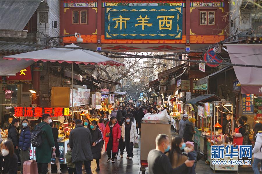 新春将至,西安市莲湖区回坊美食街内众多商户门前人气火爆、热闹非凡,众人排队采购的景象显得年味渐浓。(王智超)