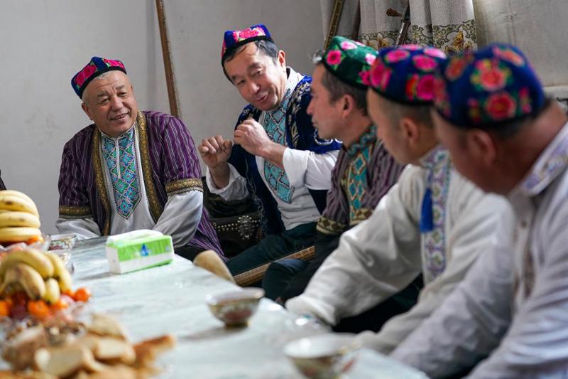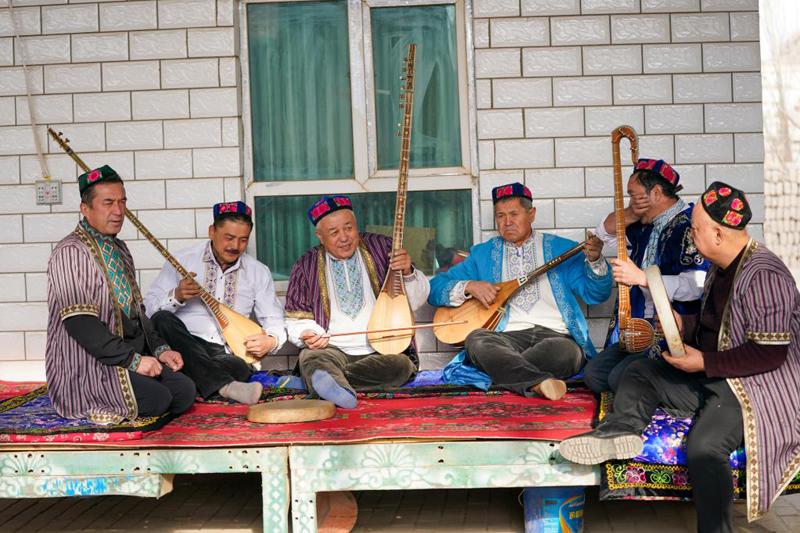 这段时间,村里的婚礼聚会多了,临近春节,各种庆祝活动也多了起来,大大小小的邀约排满了木卡姆艺人的时间表。苏来曼说,入冬以来,他已经接到20多次邀约,“给村民演出,他们喜欢,我也高兴!”