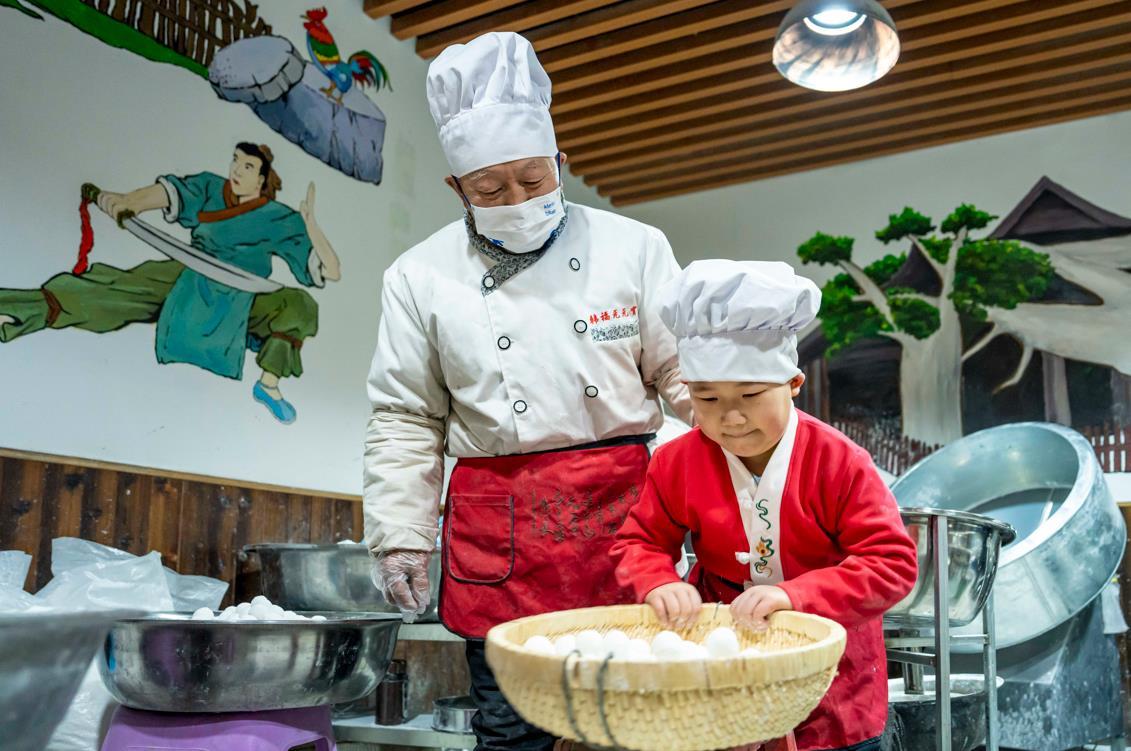 韩福元与孙子一起滚制元宵。卢鹏宇 摄