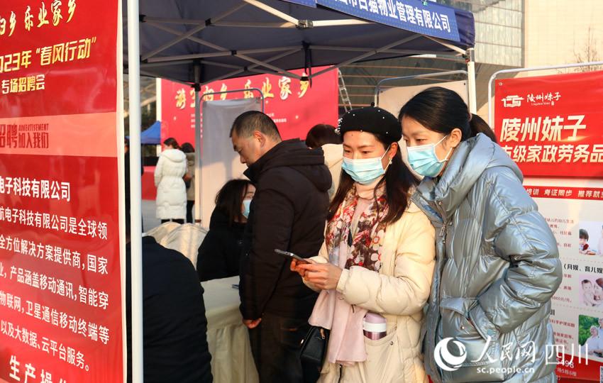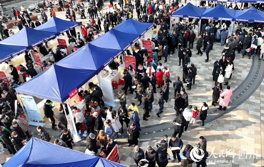 1月29日上午,在眉山市仁寿县城区的中央国际广场,前来参加招聘会的求职者络绎不绝。他们认真观看各企业的招聘展板及宣传单,挑选适合自己的岗位。