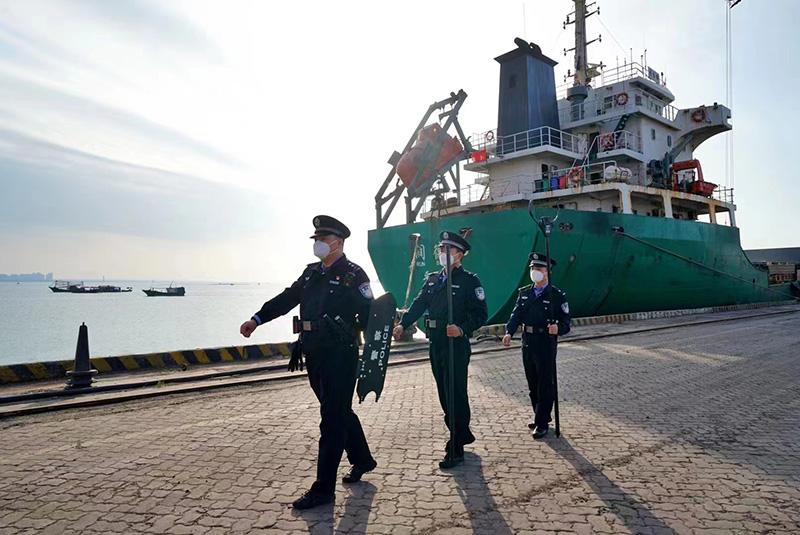 洋浦边检站民警在港口巡逻 傅绅威摄影