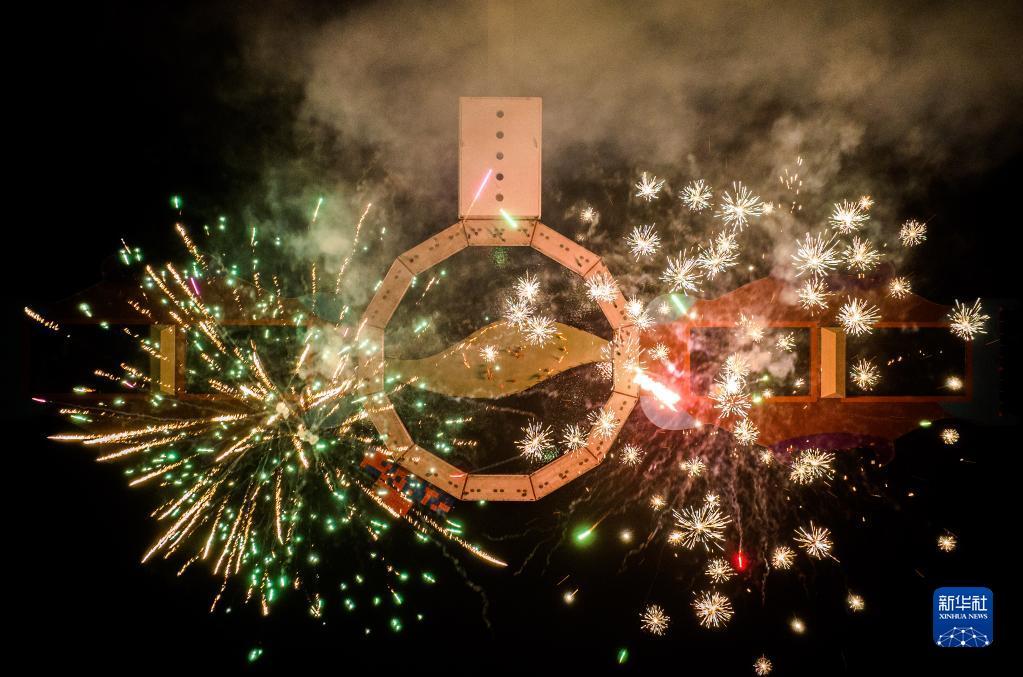 2月2日在浙江省杭州市淳安县里商乡拍摄的里商仁灯元宵表演(无人机照片)。