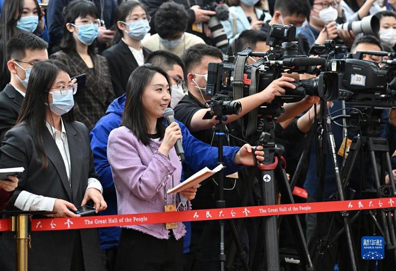 3月5日,第十四届全国人民代表大会第一次会议举行首场“部长通道”采访活动。这是新华社记者在采访。新华社记者 刘金海 摄