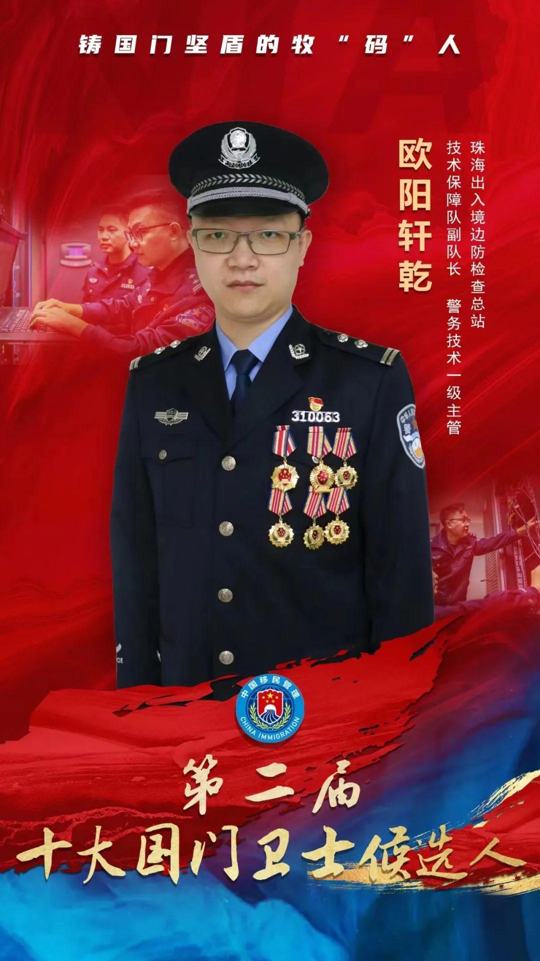 欧阳轩乾,男,汉族,1982年4月出生,2005年7月参加工作,2007年10月加入中国共产党,现任珠海出入境边防检查总站技术保障队副队长、警务技术一级主管。