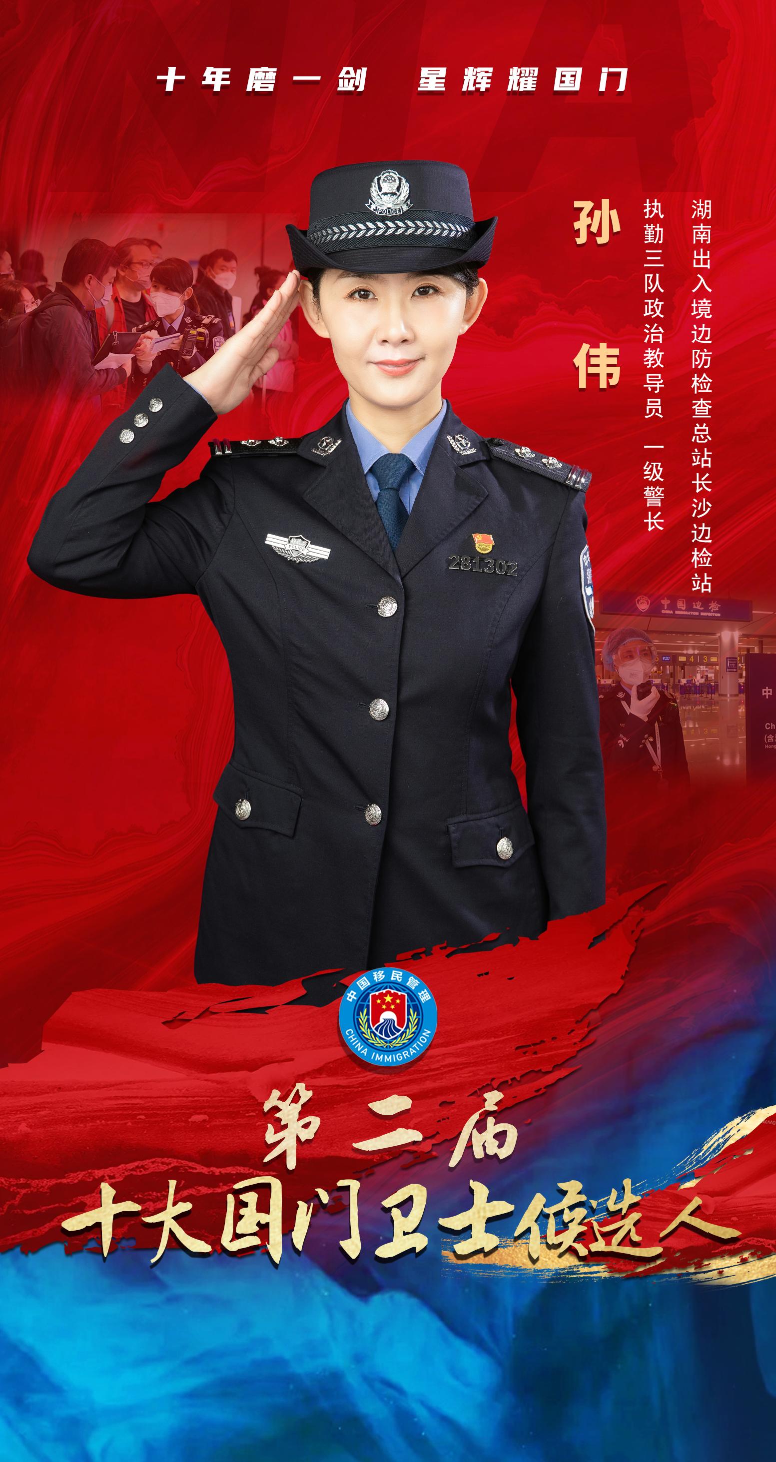 孙伟,女,汉族,1984年8月出生,2006年6月加入中国共产党,2007年6月参加工作,现为湖南出入境边防检查总站长沙边检站执勤三队政治教导员。
