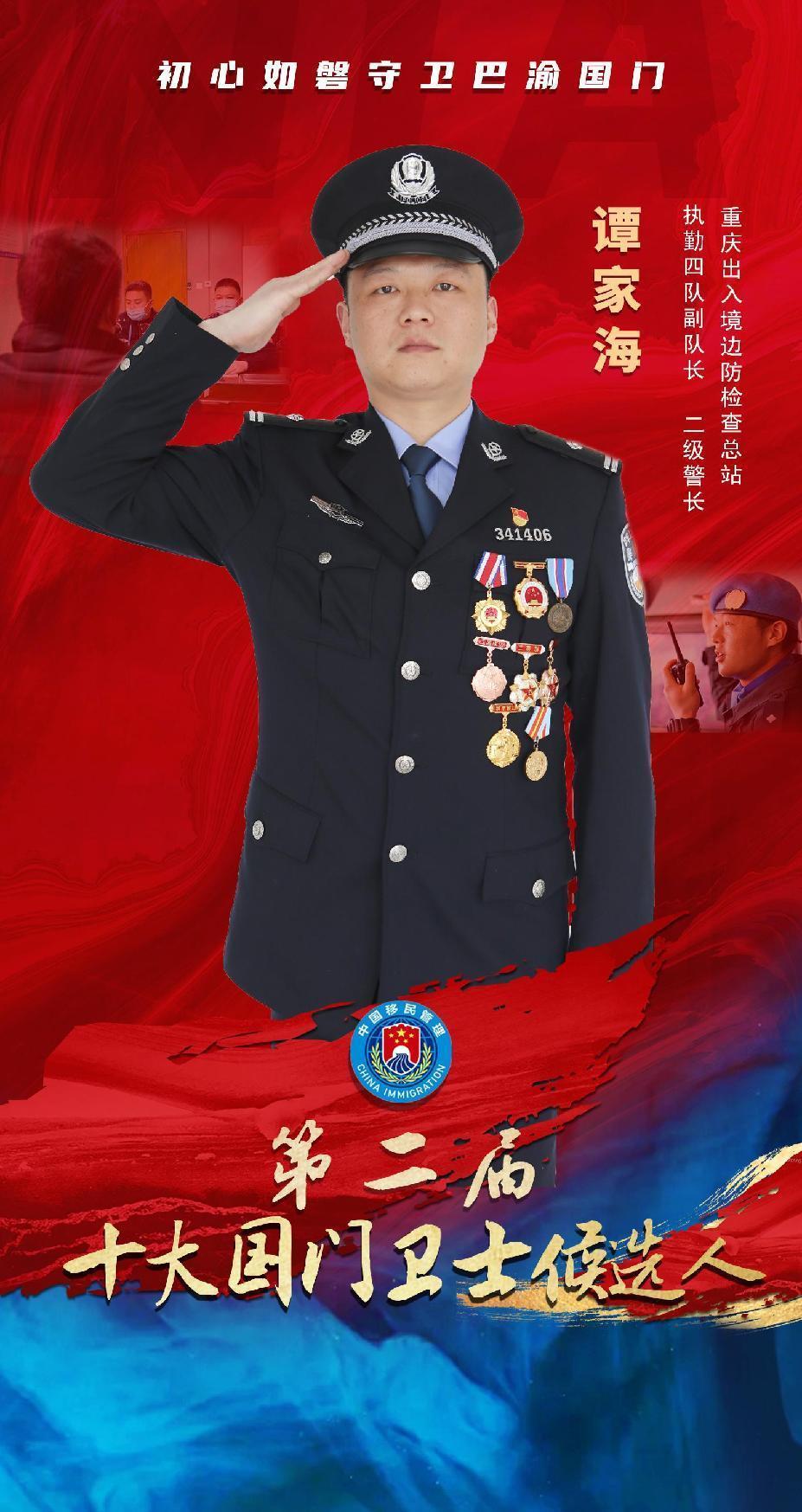 谭家海,男,汉族,1988年4月出生,2009年4月入党,2009年6月参加工作,现任重庆出入境边防检查总站执勤四队副队长。
