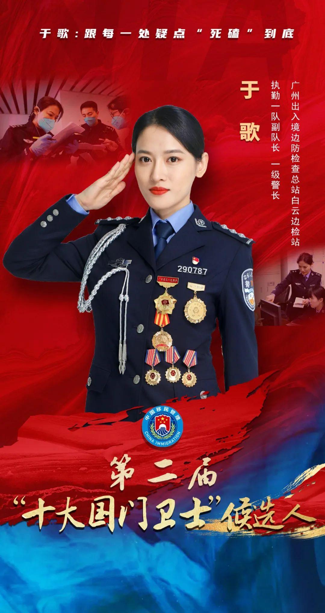 入警12年来,于歌始终扎根边检执勤一线,苦练查验本领,真诚服务出入境旅客,严厉打击跨境违法犯罪,累计查验出入境旅客超35万人次,查获各类违法违规人员170余人次,先后荣立个人二等功1次、个人三等功4次、嘉奖3次,获评“全国巾帼建功标兵”“第20届全国青年岗位能手”“广东省五一劳动奖章”“广东省三八红旗手”“广东向上向善好青年”等称号。