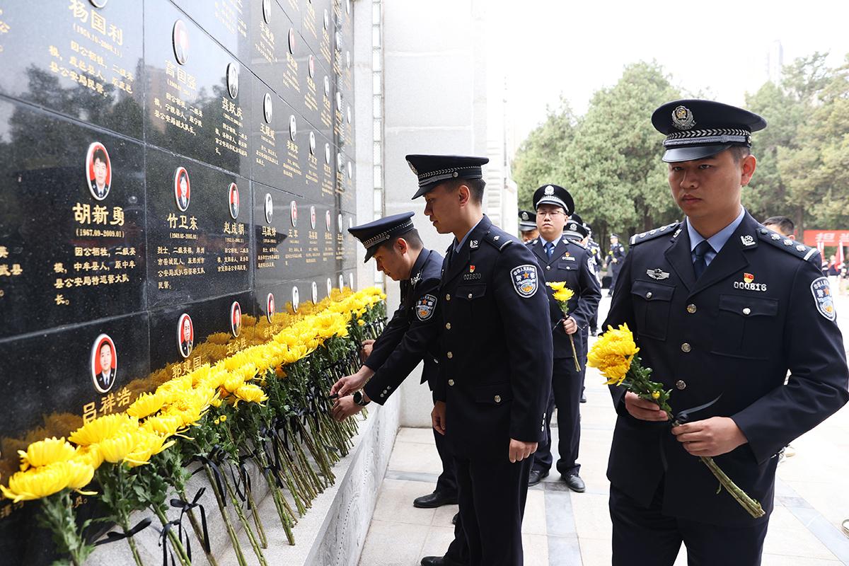 3月31日,河南省公安厅机关青年民警代表120余人来到郑州烈士陵园河南公安英烈纪念广场开展清明祭英烈活动。全省公安民警牢记宗旨使命,忠诚履职尽责,勇于担当作为,甘于牺牲奉献,仅2022年以来,全省公安机关就有30名民警为公安事业献出了宝贵的生命。图为民警敬献鲜花。