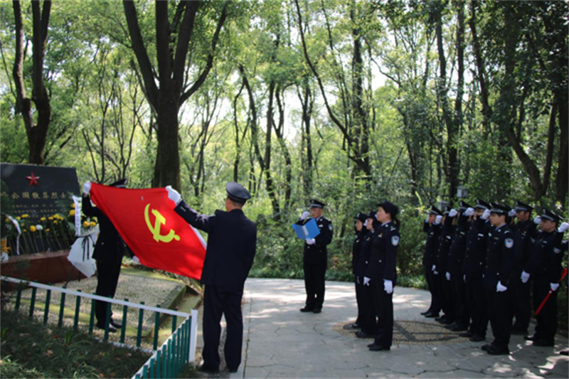 上午10时许,祭扫仪式开始。全体民辅警整装列队,肃立烈士墓碑前,在庄严肃穆的氛围中,王永生、杜杰同志缓步上前,向烈士墓碑及长眠在此的革命先烈敬献花篮并为花篮梳理挽联。随后,全体人员脱帽肃立默哀,并向革命烈士敬献鲜花。最后,面对庄严的党旗,全体人员举起右手重温了入党誓词,表达了对党的赤诚之心。