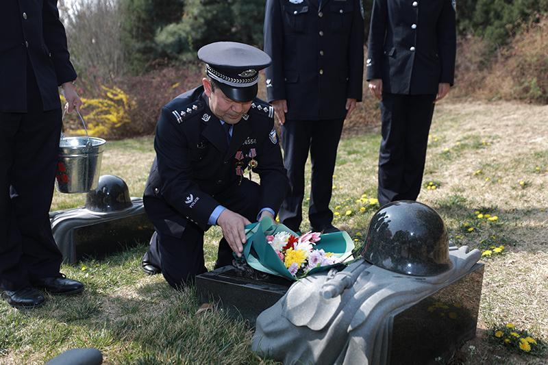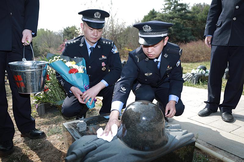 图为公安民警代表擦拭墓碑,敬献鲜花,表达对烈士的哀思。