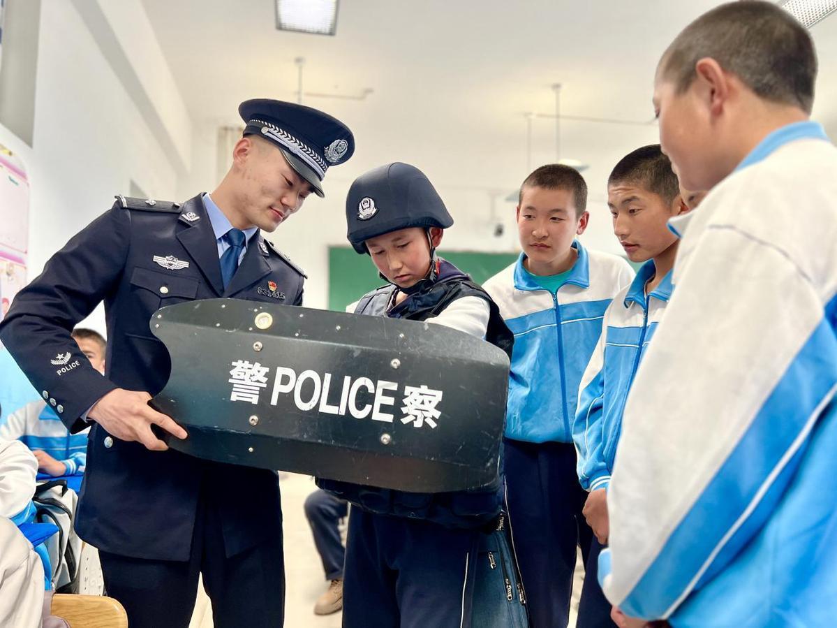 图为2023年4月11日,民警正在向学生讲解警务器材。