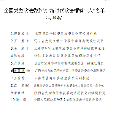 中央政法委、人力资源和社会保障部印发《关于表彰全国党委政法委系统“新时代政法楷模集体”和“新时代政法楷模个人”的决定》(以下简称《决定》),表彰33个全国党委政法委系统“新时代政法楷模集体”,10名全国党委政法委系统“新时代政法楷模个人”。