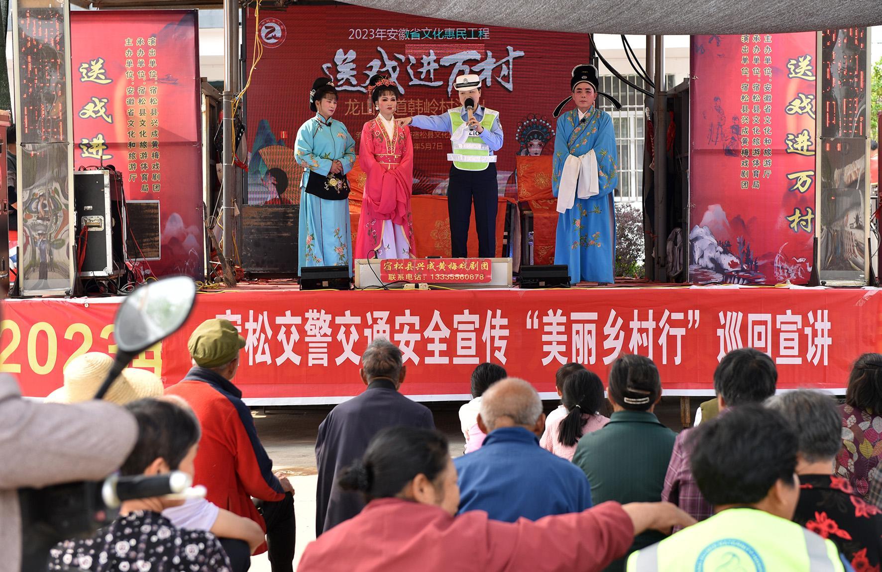 5月7日,安徽省宿松县公安局交警大队民警借助“文化惠民工程——送戏进万村”的舞台,通过现场讲演、交通安全小品、三句半等群众喜闻乐见的形式宣传交通安全。