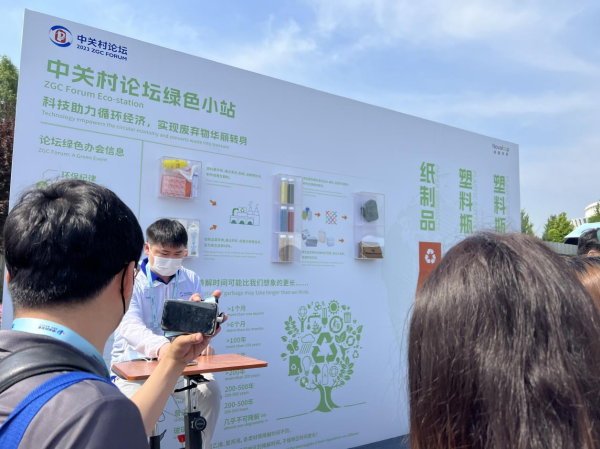 近年来,为推进“双碳”目标的实现,各级政府、各行各业都在积极探索实现的方式。2023中关村论坛突出绿色办会理念,现场绿色小站设有减碳骑行体验,参会者可通过骑特制自行车的方式,将动能转化为电能,为手机快速充电。同时,论坛在各会场设有可循环使用的分类垃圾桶和利用废弃材料制成的垃圾桶,大力宣扬垃圾分类回收理念,倡导所有参会者加入到绿色生活的行列中。