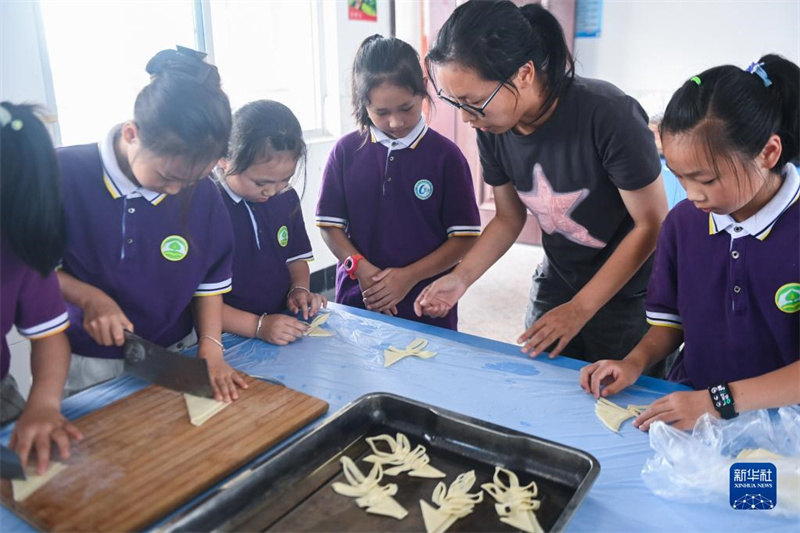 6月8日,学生们在传统习俗课上学习做当地特色美食——麦花。