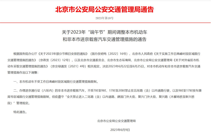 中新网6月14日电据北京市公安局公安交通管理局网站消息,北京市公安局公安交通管理局近日发布通告称,根据国务院办公厅《关于2023年部分节假日安排的通知》(国办发明电〔2022〕16号)、北京市人民政府《关于实施工作日高峰时段区域限行交通管理措施的通告》(京政发〔2023〕12号),以及北京市交通委员会、北京市生态环境局、北京市公安局公安交通管理局《关于对外省区市机动车采取交通管理措施的通告》(京交绿通发〔2021〕4号)相关规定,决定2023年6月22日至6月25日,对本市机动车和非本市进京载客汽车交通管理措施作出以下调整: