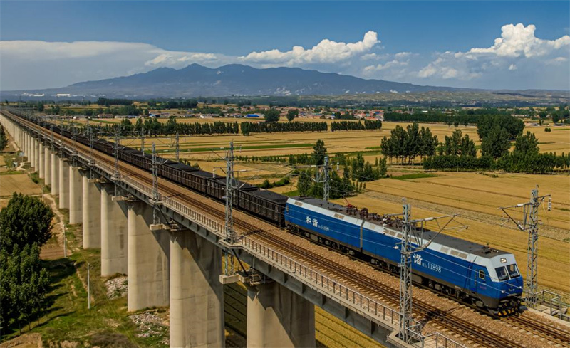 迎峰度夏保障重点物资安全高效运输,一列满载电煤的重载列车行驶在山西省临汾综合段管内的师村特大桥下行线上。新华社发(张睿摄)