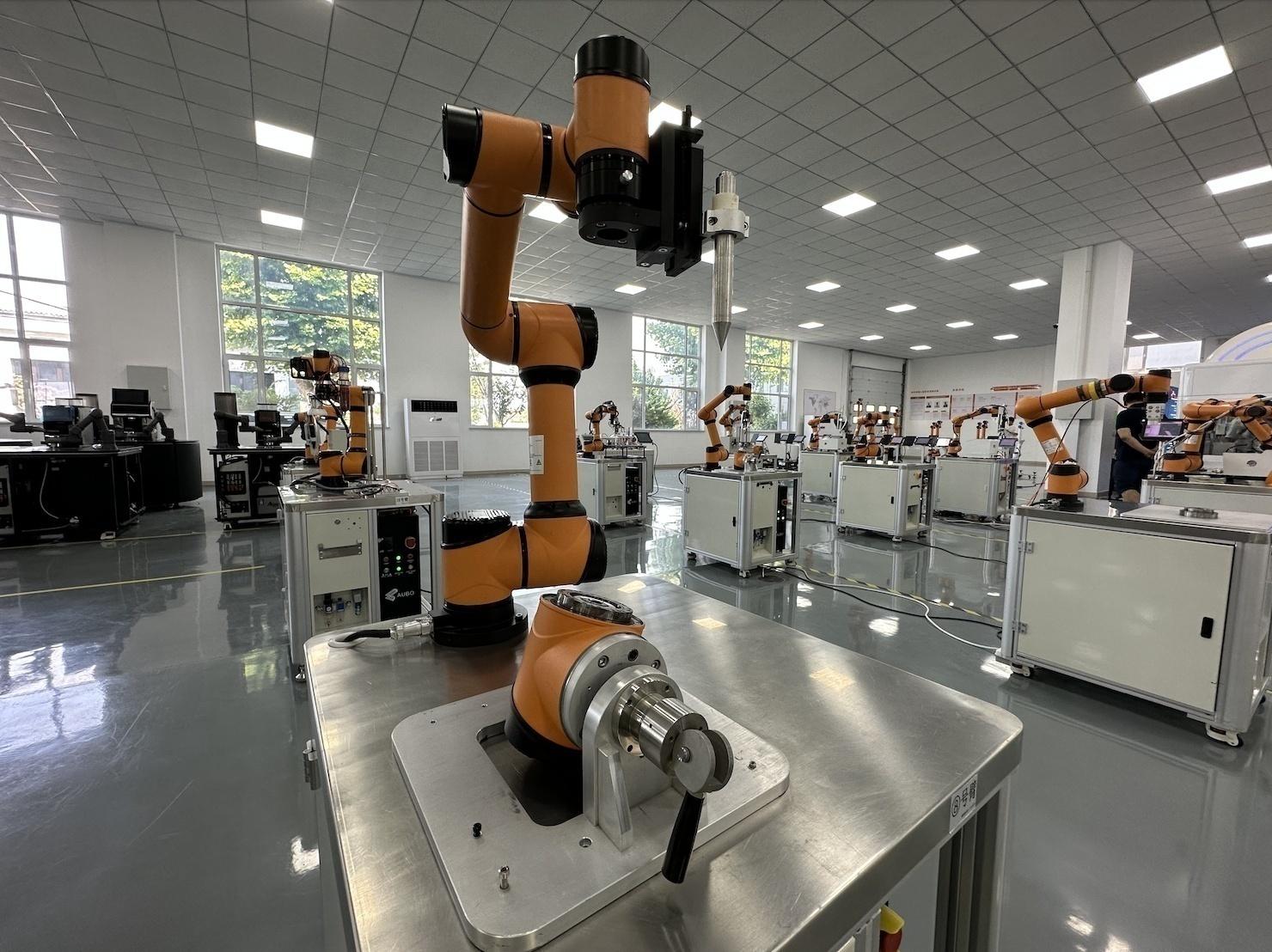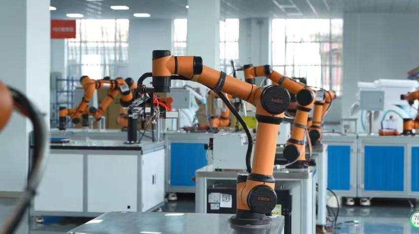 遨博(山东)智能机器人有限公司的六轴协作机器人,正在演示工业场景中的模块组装
